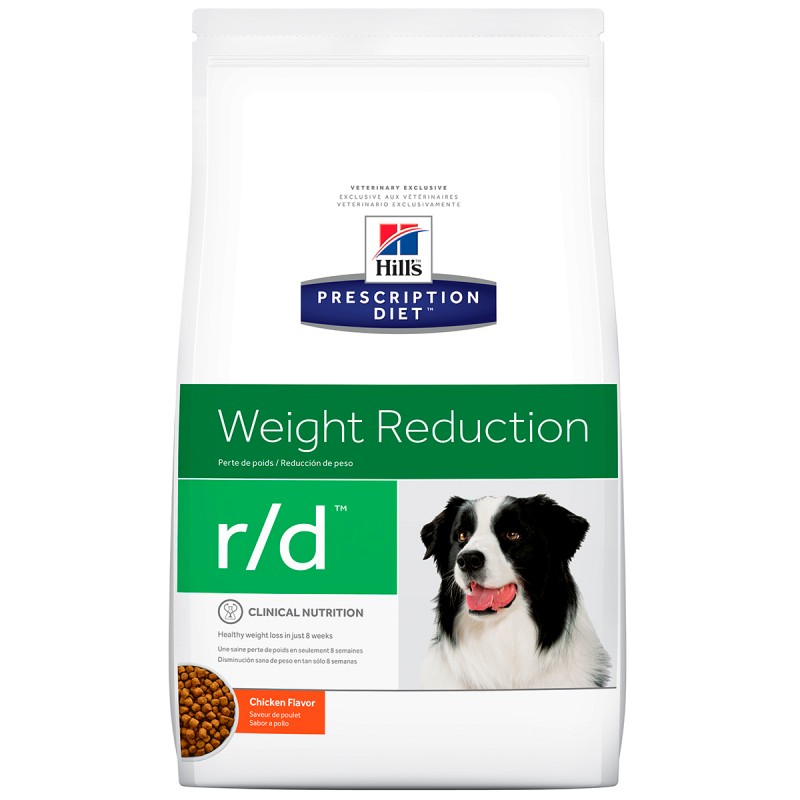 Reducción de peso  Como la epidemia en humanos, casi el 50% de la población de mascotas tiene exceso de peso. Inclusive un poco de peso de más puede impactar en la calidad de vida de la mascota y su relación con la familia porque puede reducir el tiempo de juego, impactar en su movilidad y la salud de su perro a largo plazo.   Los nutriólogos y veterinarios de Hill’s desarrollaron la nutrición clínica Prescription Diet® r/d® formulado especialmente para apoyar en el manejo del peso de su perro. De hecho, r/d es nutrición clínicamente comprobada para una disminución sana de peso en tan sólo 8 semanas Cómo funciona: • Niveles terapéuticos de L-carnitina • Mezcla óptima de fibra soluble e insoluble • Antioxidantes clínicamente comprobados   Cómo ayuda: • Ayuda a metabolizar la grasa y conservar los músculos magros • Ayuda a su perro a sentirse lleno y satisfecho • Apoya un sistema inmunológico sano   Información adicional: Hill’s® Prescription Diet® r/d® Canine proporciona toda la nutrición que su perro necesita durante la disminución de peso.  Por favor consulte a su veterinario para mayor información sobre cómo pueden los alimentos Prescription Diet® ayudar a su perro para disfrutar una vida feliz y activa. Grasa Fibra Bajo Alto Disminuir el consumo de calorías lo que ayuda a reducir la grasa corporal y disminuir los niveles de lípidos en sangre en pacientes con hiperlipidemia. Fibra soluble e insoluble para provocar saciedad y mantener la salud gastrointestinal. Carnitina Alto Ayudar a los perros a quemar grasa a la vez de mantener la masa muscular magra, resultando en una pérdida de peso más eficaz. Lisina Alto Ayudar a metabolizar la grasa para la producción de energía y mantener la masa corporal magra. Antioxidantes Añadidos Defender las células de la oxidación de los radicales libres, promoviendo un sistema inmunológico sano. Weight Control Target Weight of Dog Weight Loss Weight Control 1 kg 20 g / 1/4 cups 40 g / 1/2 cups 2 kg 40 g / 1/2 cups 60 g / 3/4 cups 4 kg 60 g / 3/4 cups 110 g / 1 1/3 cups 5 kg 80 g / 1 cups 125 g / 1 1/2 cups 10 kg 135 g / 1 2/3 cups 205 g / 2 1/2 cups 20 kg 220 g / 2 2/3 cups 355 g / 4 1/3 cups 30 kg 300 g / 3 2/3 cups 470 g / 5 3/4 cups 40 kg 370 g / 4 1/2 cups 595 g / 7 1/4 cups 50 kg 435 g / 5 1/3 cups 710 g / 8 2/3 cups 60 kg 515 g / 6 1/4 cups 800 g / 9 3/4 cups Weight Control Weight of Dog Amount to Feed (grams) Amount to Feed (grams) (kg) Weight loss Adult maintenance 1 20 30 2 35 50 4 55 90 5 65 105 10 110 175 20 185 295 30 250 400 40 310 495 50 365 585 60 420 670 Ajuste las cantidades de alimento según sea necesario para mantener un peso óptimo. Si tiene dudas, consulte a su veterinario. Para mejores resultados y prácticas de seguridad: • Haga una transición gradual hacia el alimento nuevo de su mascota en un periodo de 7 días. • Administre exclusivamente el alimento seco, enlatado y premios de Prescription Diet recomendado. • Mantenga agua fresca disponible en todo momento. • Haga que su veterinario monitoree la condición de su mascota. • Para prevenir asfixia, mantenga el empaque fuera del alcance de mascotas y niños. 2982 kcal/kg (245 kcal/cup†) Nutriente Materia Seca1% Proteína 34.6 Grasa 8.3 Fibra bruta 12.7 Carbohidratos (ELN) 39.0 Calcio 0.72 Phosphorous 0.56 Sodio 0.27 Potasio 0.92 Magnesio 0.120 L-carnitina 339.5 ppm Vitamina C 318 ppm Vitamina E 558 IU/kg Fibra insoluble 23.1 Fibra soluble 2.1 Fibra dietética total 25.2