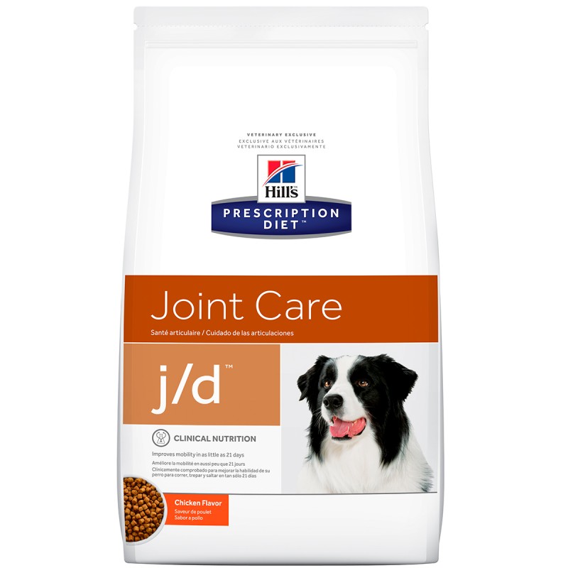 Mejorar la movilidad de su perro es tan sencillo como darle la nutrición correcta. Ser proactivo en temas de movilidad en una etapa temprana puede evitar la necesidad de tratamientos más agresivos. Hill's® Prescription Diet® j / d® ayuda a su pero a caminar, correr y saltar más fácilmente en tan sólo 21 días. Hill's® Prescription Diet® j / d® Canine es un alimento completo y balanceado que proporciona toda la nutrición que su perro necesita.     Cómo funciona: • Niveles terapéuticos de ácidos grasos omega-3 • Enriquecido con glucosamina y sulfato de condroitina • Calorías controladas y L-carnitina • Antioxidantes clínicamente comprobados   Cómo ayuda: • Ayuda a preservar el cartílago de las articulaciones • Ayuda a mantener un peso sano y evitar estrés adicional en las articulaciones • Apoya un sistema inmunológico sano   Información adicional: Por favor consulte a su veterinario para mayor información sobre cómo pueden los alimentos Prescription Diet® ayudar a su perro para disfrutar una vida feliz y activa.   Ácido eicosapentaenoico (EPA) Ácido alfa-linoleico (AAL) Alto Los ácidos grasos trabajan para interrumpir la degradación del cartílago. Glucosamina Condroitina Añadidos Proporcionar los elementos constitutivos para la reparación de cartílagos. Carnitina Alto Ayudar a los perros quemar grasa a la vez que mantiene la masa muscular magra. Antioxidantes Añadidos Defender las células de la oxidación de los radicales libres, promoviendo un sistema inmunológico sano. Mantenimiento de adultos Peso del perro Cantidad por día 1 kilogramo 30 g 2 kilogramos 55 g 4 kilogramos 90 g 5 kilogramos 105 gramos 10 kilogramos 175 gramos 20 kilogramos 300 g 30 kilogramos 405 g 40 kilogramos 500 g 50 kilogramos 590 g 60 kilogramos 680 g Ajuste las cantidades de alimento según sea necesario para mantener un peso óptimo. Si tiene dudas, consulte a su veterinario.  Para mejores resultados y prácticas de seguridad: Haga una transición gradual hacia el alimento nuevo de su mascota en un período de 7 días. Administre exclusivamente el alimento seco, enlatado y premios de Prescription Diet recomendado.   Mantenga agua fresca disponible en todo momento. Haga que su veterinario monitoree la condición de su mascota. Para prevenir asfixia, mantener este empaque fuera del alcance de mascotas y niños. 3868 kcal / kg (353 kcal / taza †) Nutriente Materia Seca 1 % Proteína 19,2 Grasa 16,5 Fibra bruta 8.3 Carbohidratos (ELN) 51,3 Calcio 0,64 Fosforoso 0,49 Sodio 0,20 Potasio 0,80 Magnesio 0,144 L-carnitina 348,7 ppm Vitamina C 200 ppm Vitamina E 557 UI / kg EPA 0.451 Ácidos grasos omega-3 3,45 Ácido alfa-linolénico 2.51