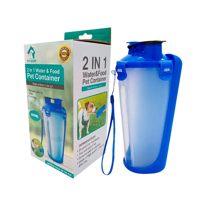 Eficiente diseño doble y plegable que integra botella y recipiente antiderrames, permitiéndote llevar agua para tu perro al salir de paseo o de viaje. Y del otro lado croquetas para tu mascota.